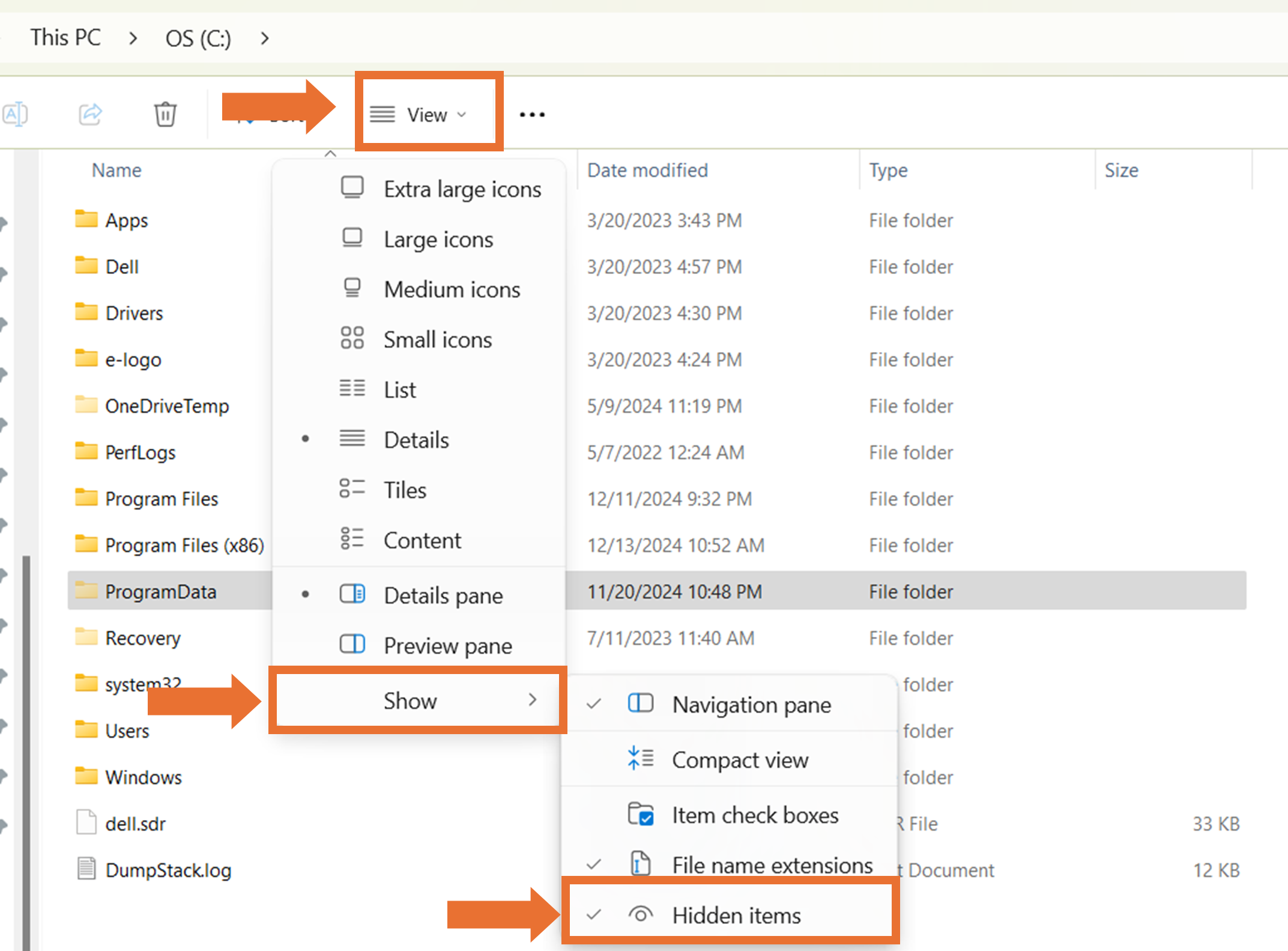 Allow hidden files to be displayed by selecting View and then Show. Make sure the Hidden items is checked to show hidden files.