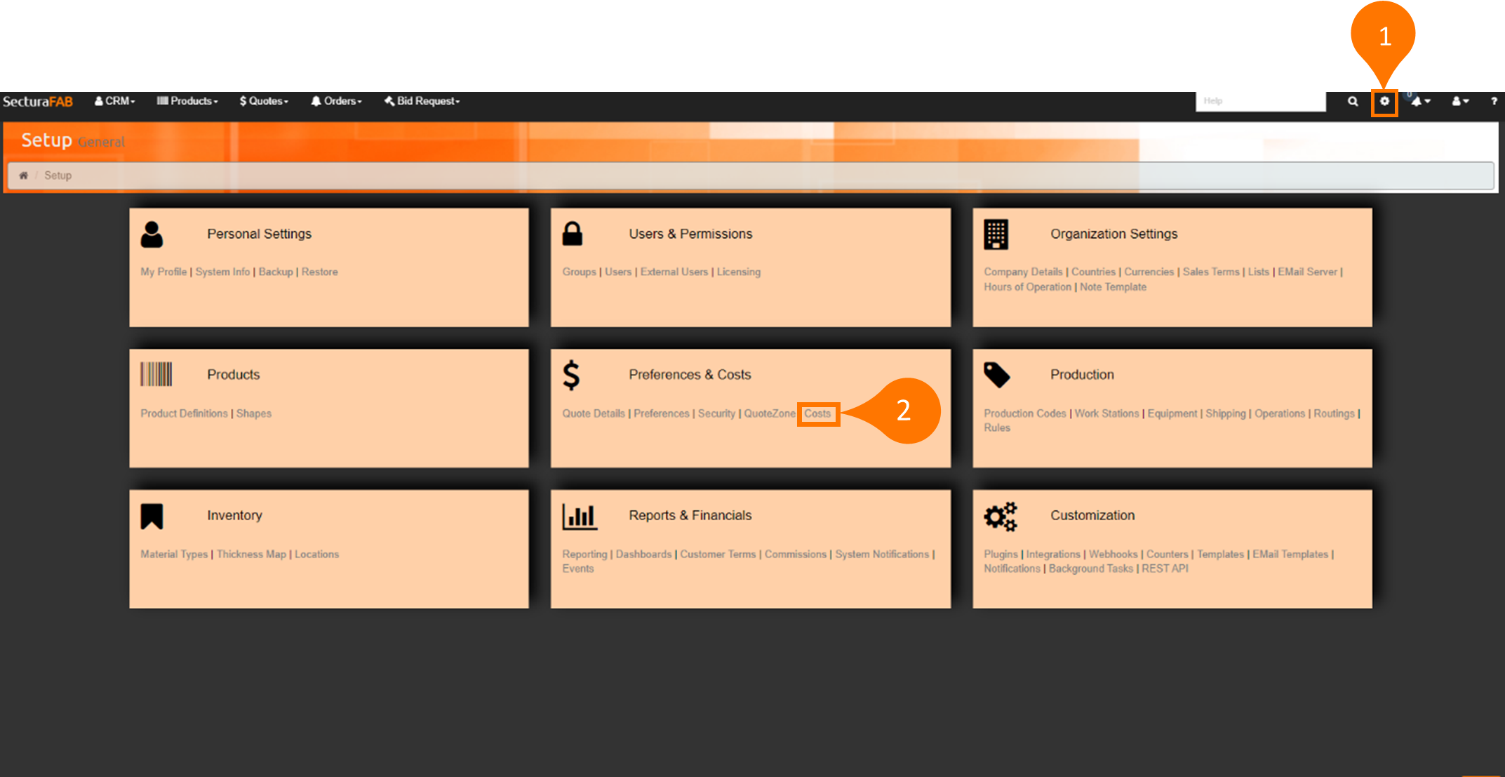 - Select the Settings gear. Then choose “Costs” from the Preferences & Costs options.