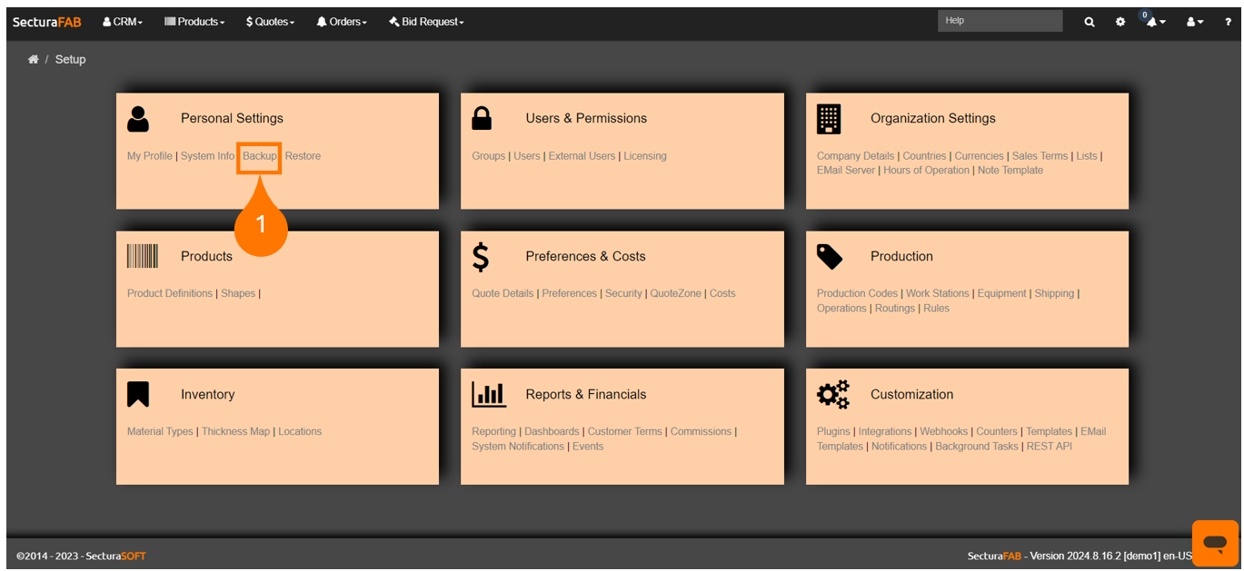 In "Personal Settings", select "Backup." This action will trigger a download of your operational tenant information. The backup file will include all settings and operational data accessible from the setup page.