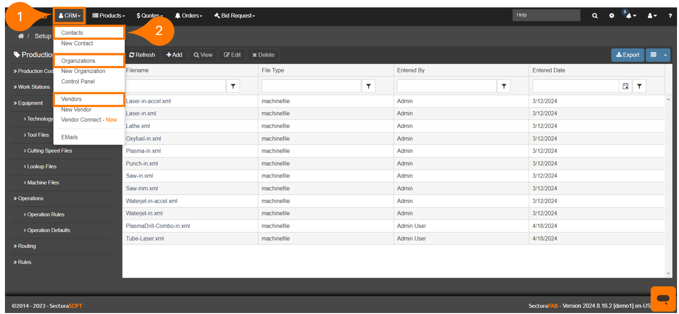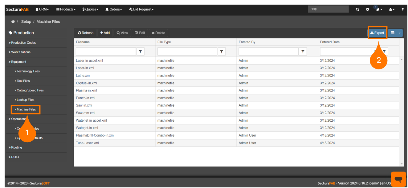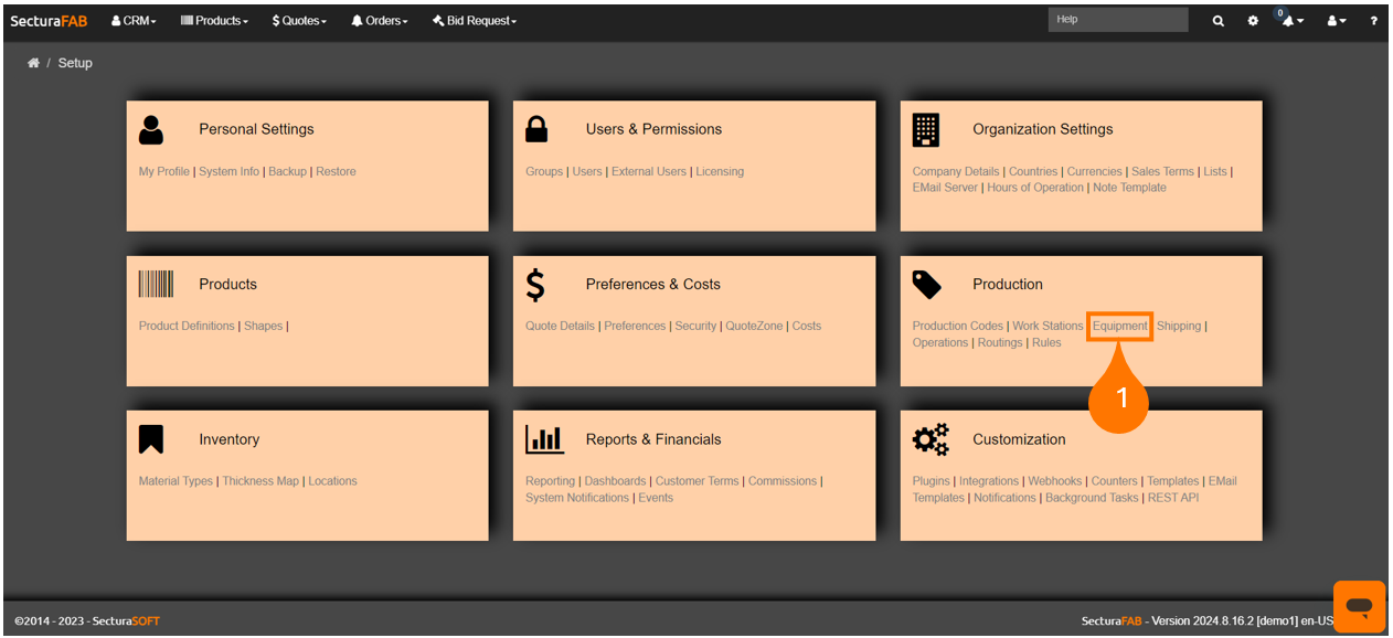 Note: The current backup does not support Machine File export, so this step must be done manually. Navigate to “Equipment” in the Production settings.