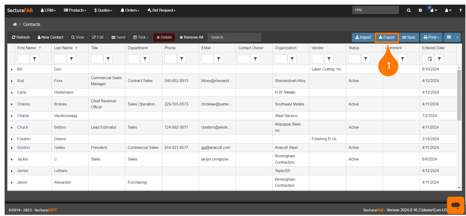 The CRM holds 3 tables: Contacts, Organizations, and Vendors. Each will have to be exported. Let’s start by selecting “Contacts.”