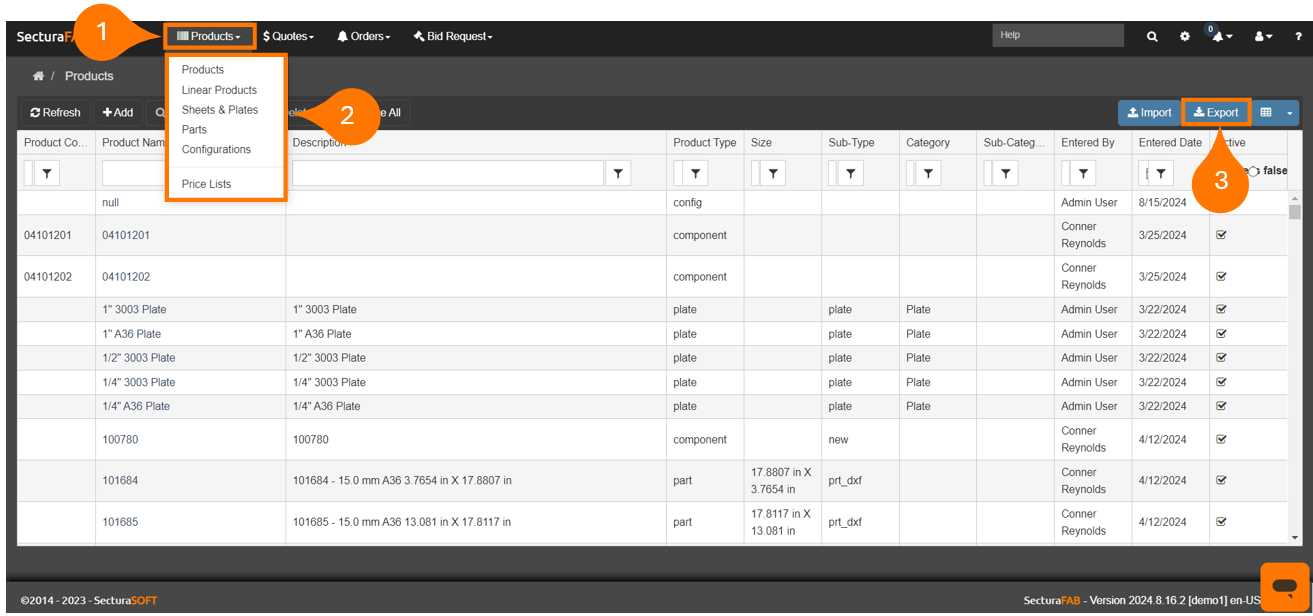 Go to the Products section and select “Export.” The "Products" table includes linear products, plate products, and components all in one table, so you don’t need to export these separately.