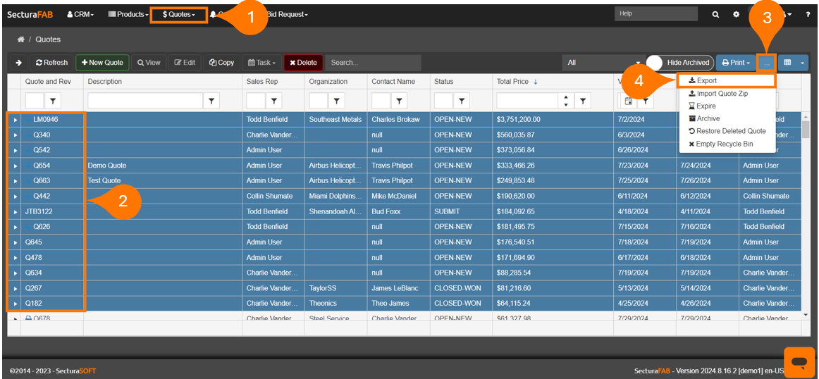 Navigate to your Quotes dashboard. Highlight all the quotes you wish to export. Click the ellipses to access the drop-down menu and select the export option. The download will be a zipped file containing each highlighted quote.