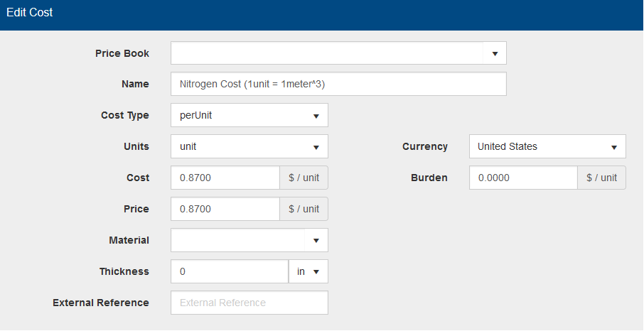 For each gas-consumable, create a new cost. The cost type is "perUnit." Treat one unit as the unit for purchase. In this example, the user purchases nitrogen by cubic foot, so it is noted in the cost name. If the nitrogen was purchased by the cubic foot, the cost would be built the same. The only thing that would change is the market cost and the note in the name. If market cost changes, all you need to do is return to this cost and edit the cost and price values. Before proceeding, make sure that you have a cost created for each gas type, and that they are perUnit cost types.