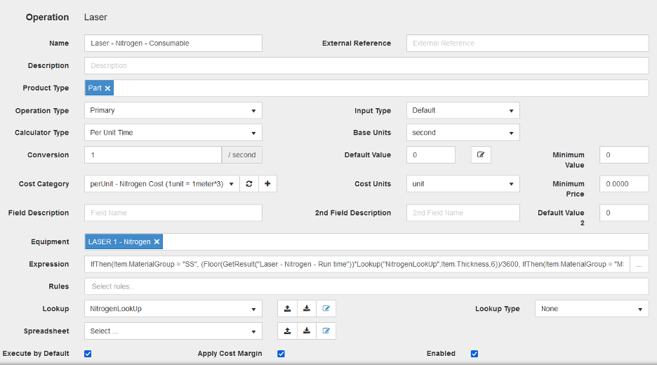 IfThen(Item.MaterialGroup = "SS", (Floor(GetResult("Laser - Run time"))*Lookup("NitrogenLookUp",Item.Thickness, 2))/3600, IfThen(Item.MaterialGroup = "MS", (Floor(GetResult( "Laser - Run time" ))*Lookup("NitrogenLookUp",Item.Thickness, 3))/3600, IfThen(Item.MaterialGroup = "AL", (Floor(GetResult("Laser - Run time"))*Lookup("NitrogenLookUp",Item.Thickness, 4))/3600, 13)))