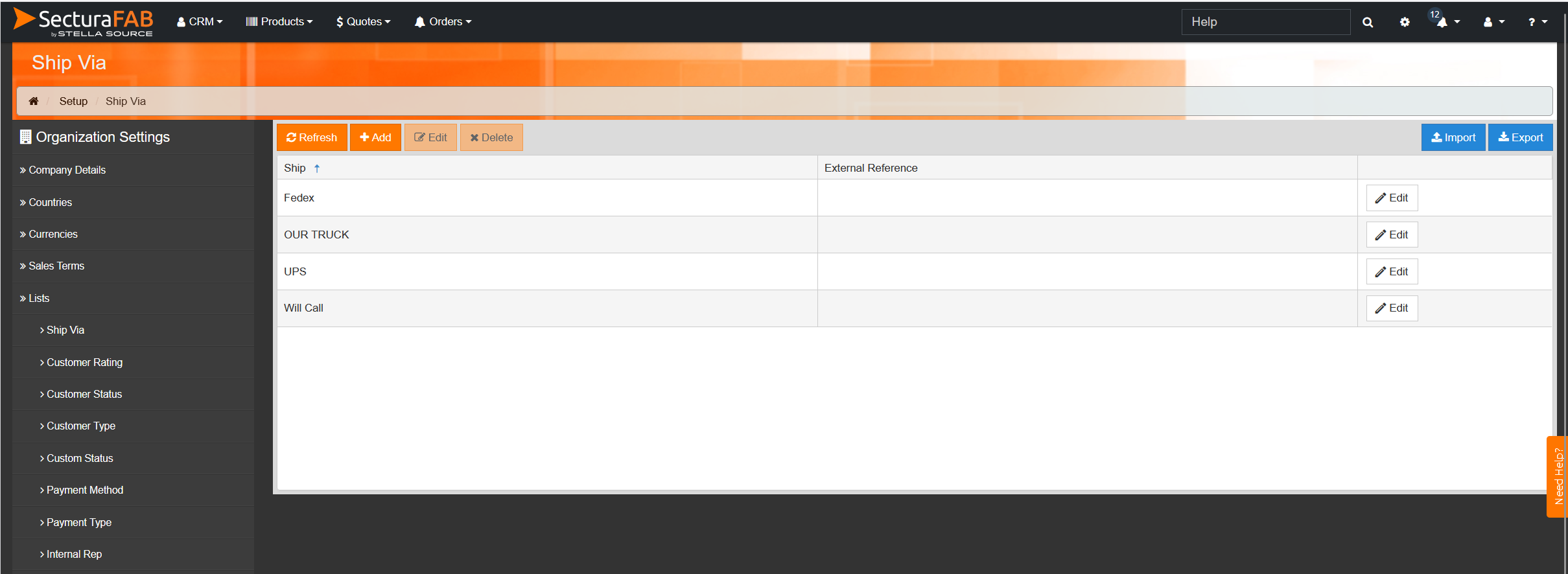 Use the Master List of all the Ship Via options that are available to add, edit, or delete items. You can also Import or export Ship Via items using .csv files.