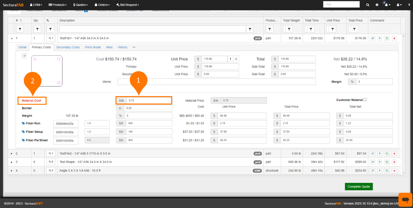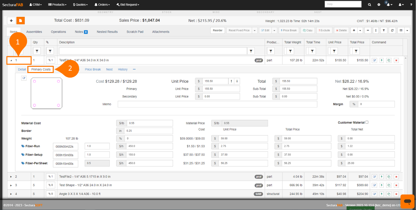1. Expand a quoted line item to view the “Primary Costs” tab.