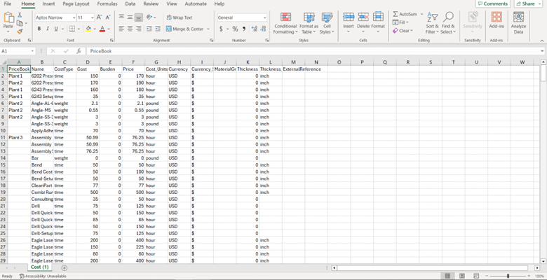 2. A CSV will then download which can be opened in Excel. Make bulk changes here and select “Import” to update the costs in SecturaFAB with your new CSV.