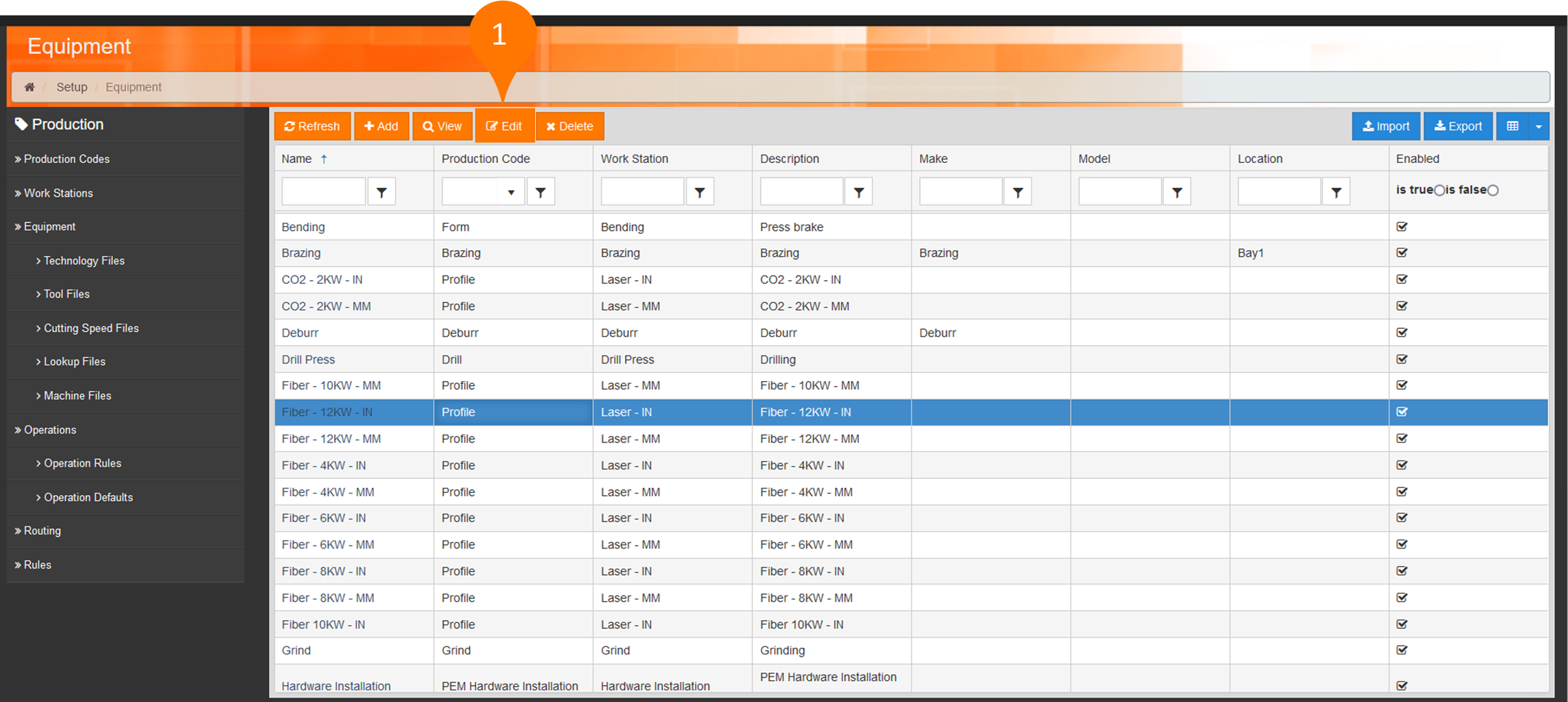 1. Choose the equipment that you want to edit and select “Edit.” If you need help navigating to the equipment screen, utilize “General Navigation” in the knowledge base.
