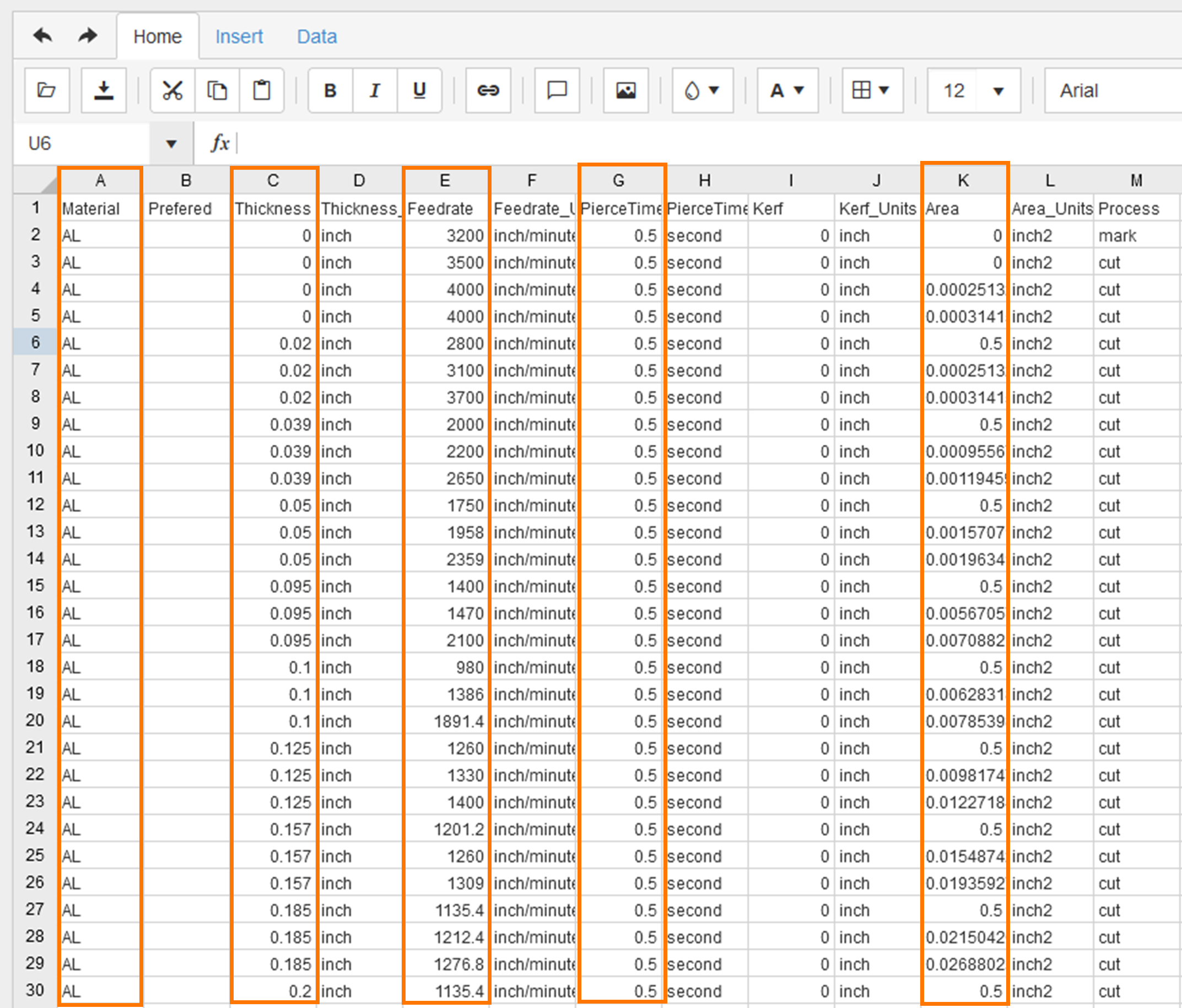 E: Feedrate – This column is equipment cutting speed. Each cutting speed has a unique material grade, thickness, and area lookup associated with it.