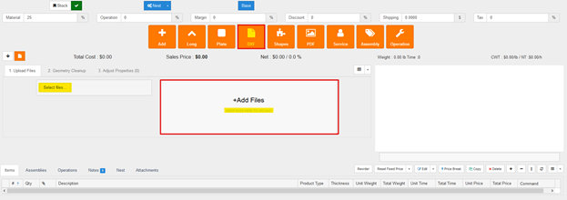 If you notice that your Material Cost shows a 0 value, this means that you will need to add this material type, and its thickness, to your cost table. In this case, we would be looking at adding a cost for the material A1011, at either all thicknesses, or just out 0.105 thickness. If this is the case, please have a look at the following Knowledge Base article: