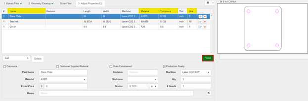 The fourth and final step is verifying that the data is correct, and clicking the green “Finish” button. Now the DXF files, have been added as line items to the quote, using the material, thickness, and quantity that was specified in the CSV file.