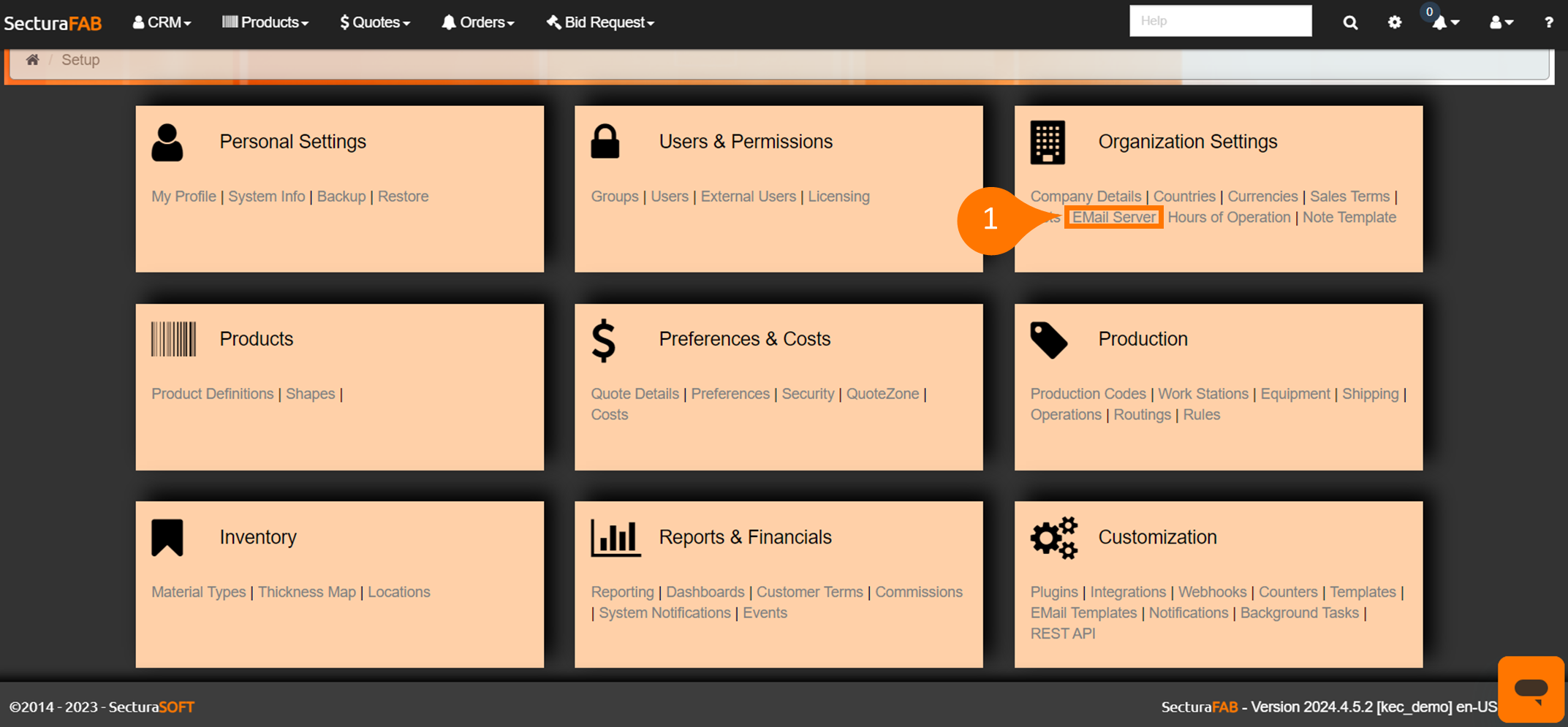 1. From the settings menu, select “Email Server” within the Organization Settings.