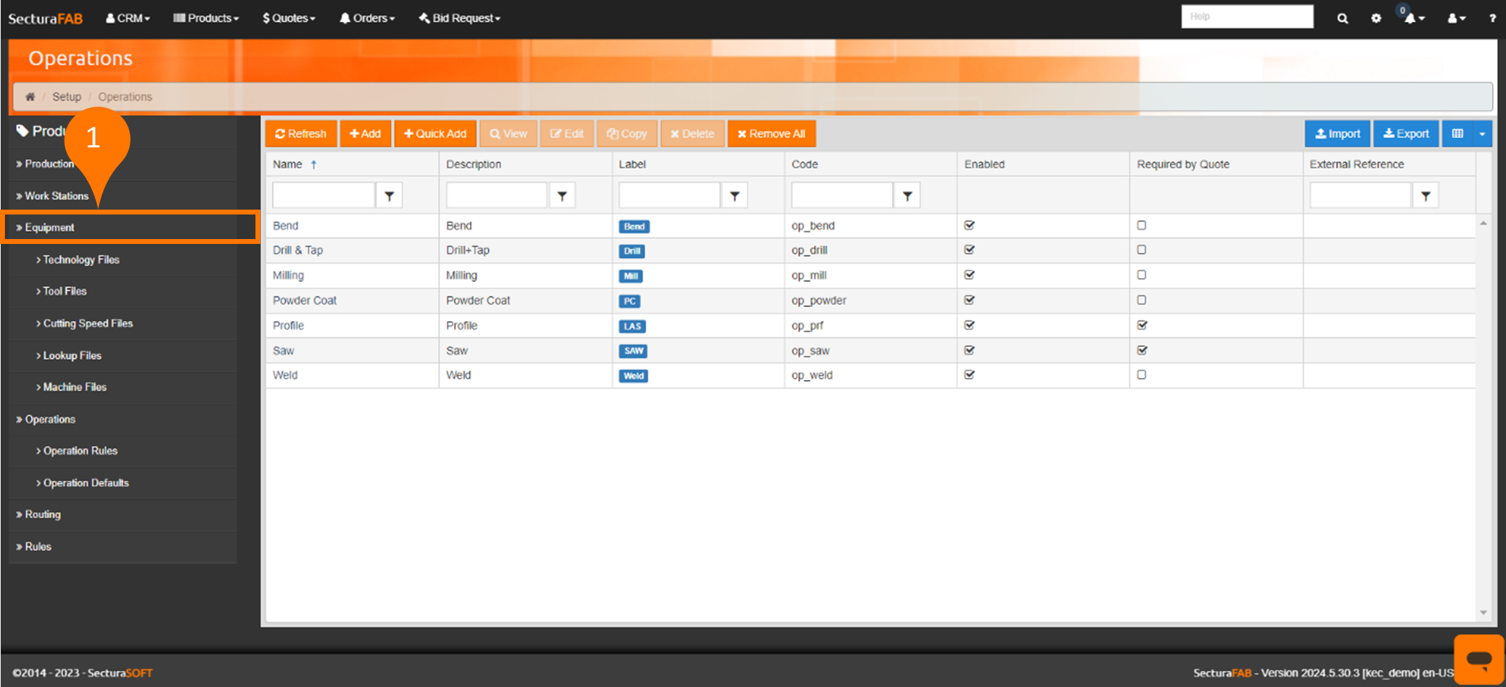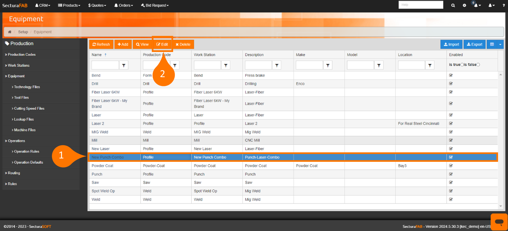 1. First you will need to quick add a punch combo operation. Learn more about how to use “quick add” for a punch combo operation in our resource center. After the operation is added let’s explore the equipment. Select “Equipment” from the production settings.