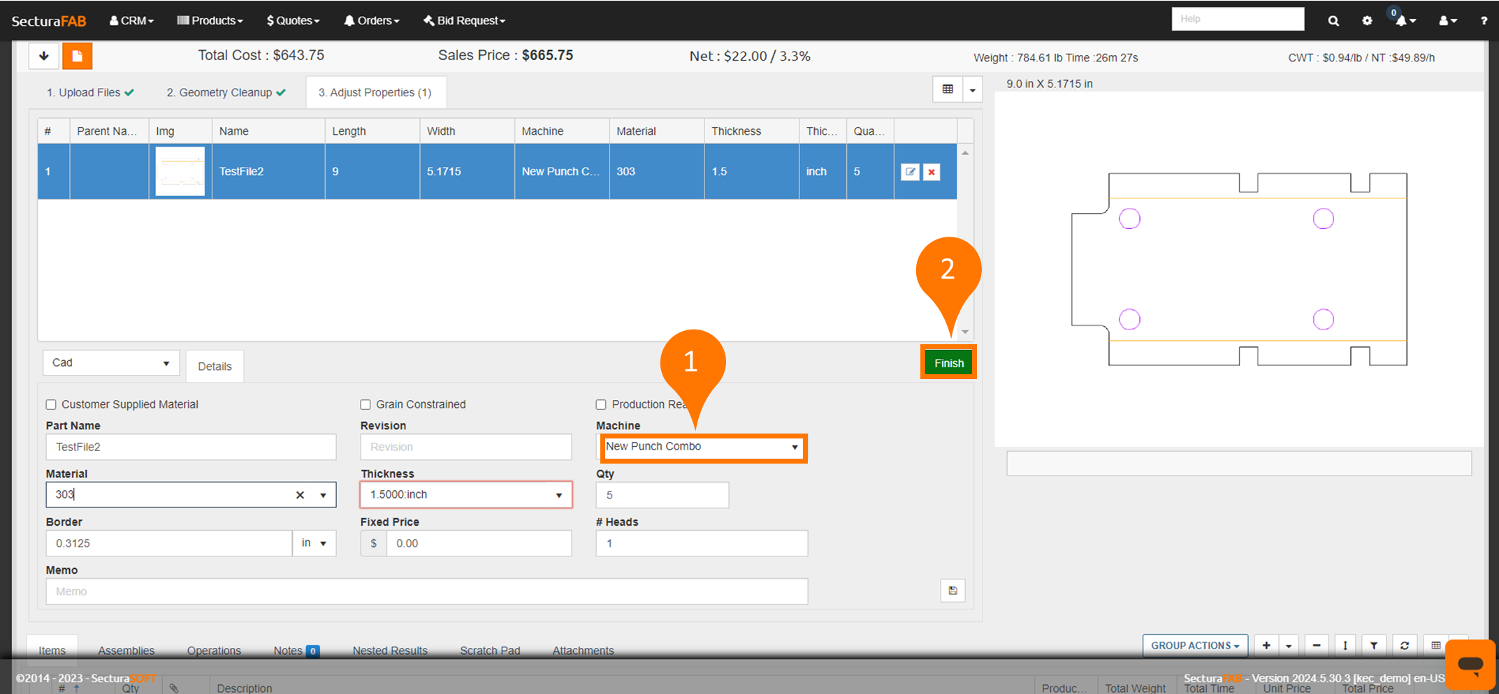 11. Select the machine as the new punch combo operation during the adjust properties stage. Then select “Finish” to add it to the quote.