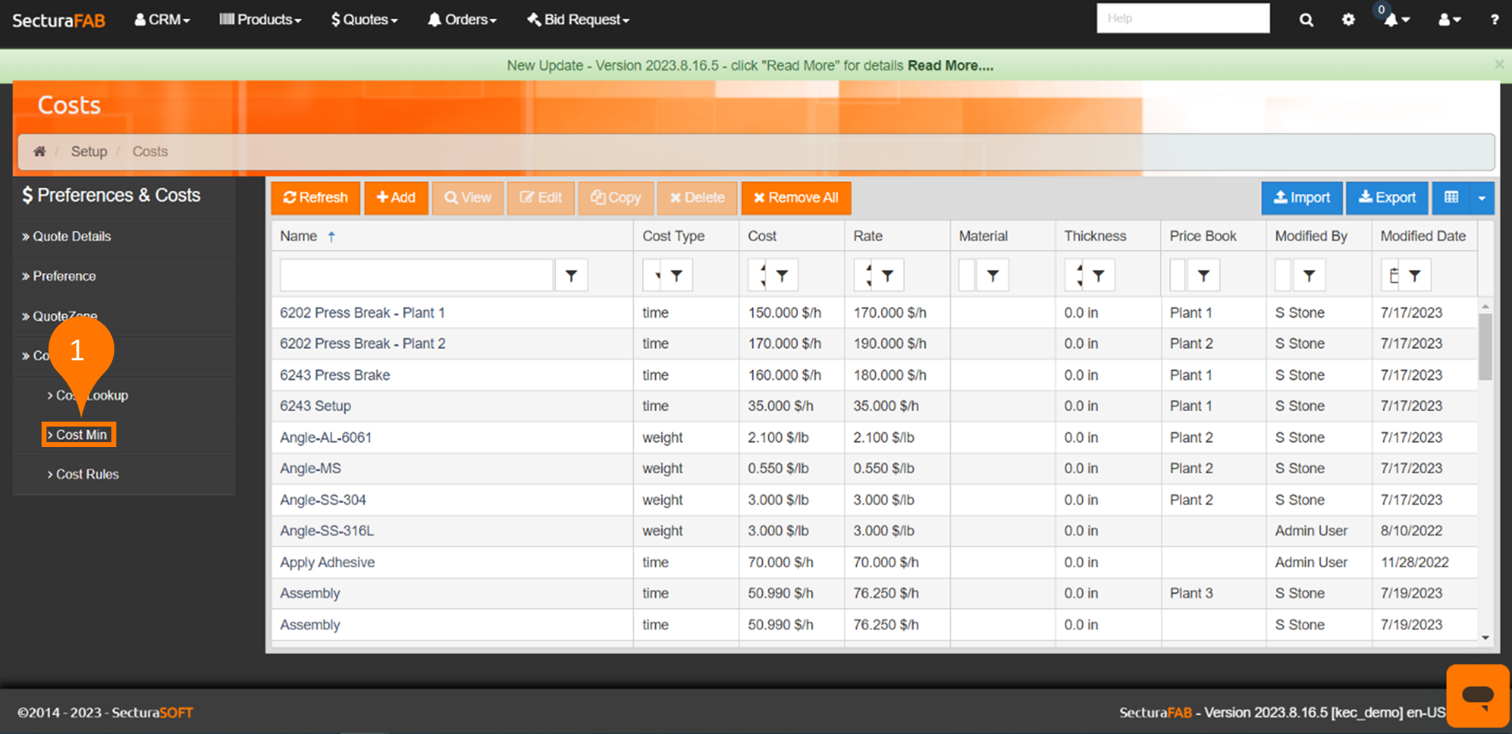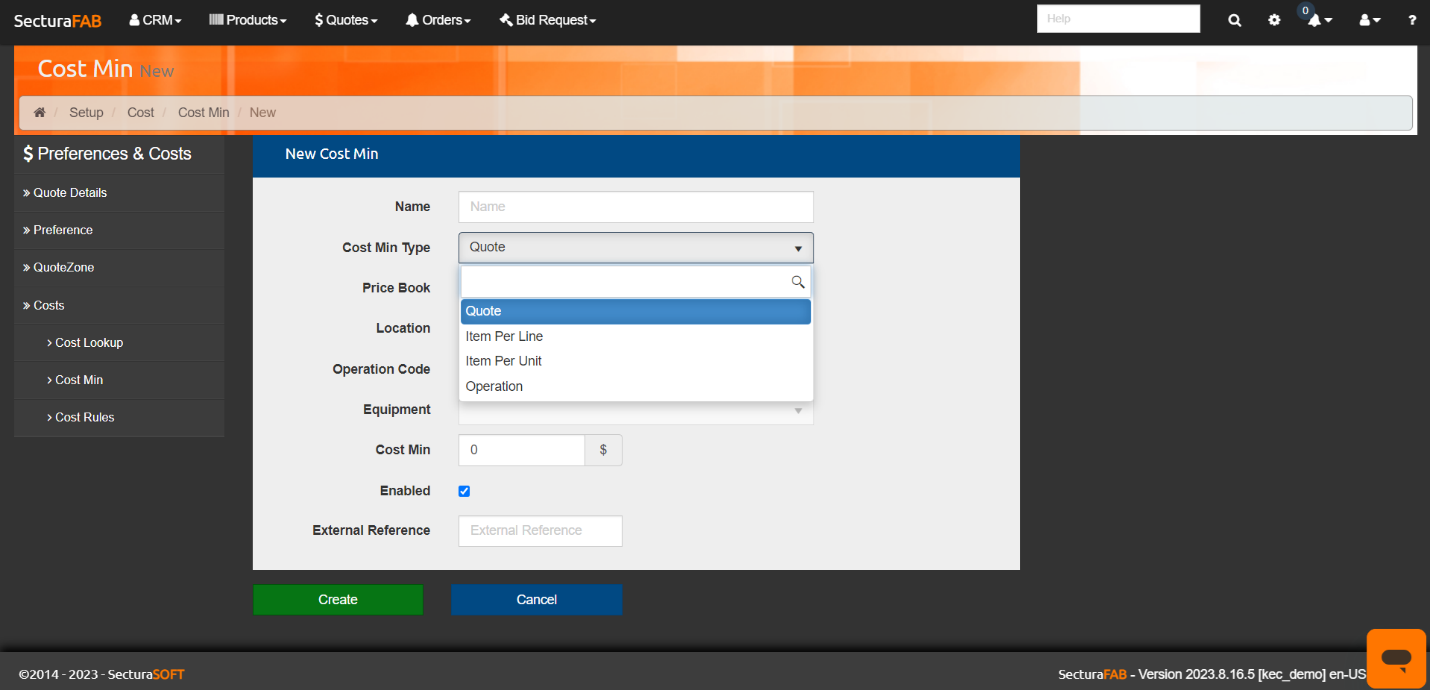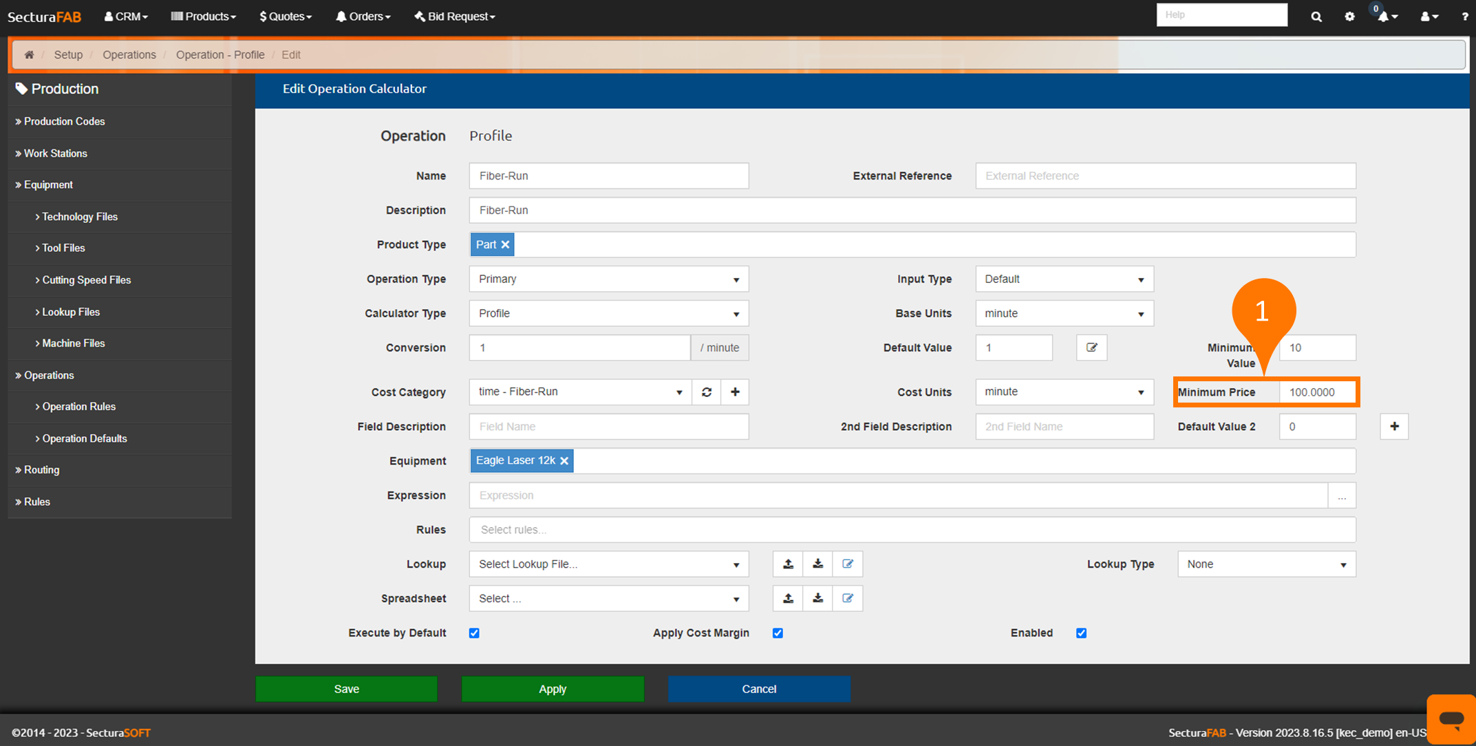 Minimum Price is an override of a time or price based on a rule or setting. Apply minimum price to an operation calculator, per unit, line item, quote, or equipment to ensure operation and material profits.