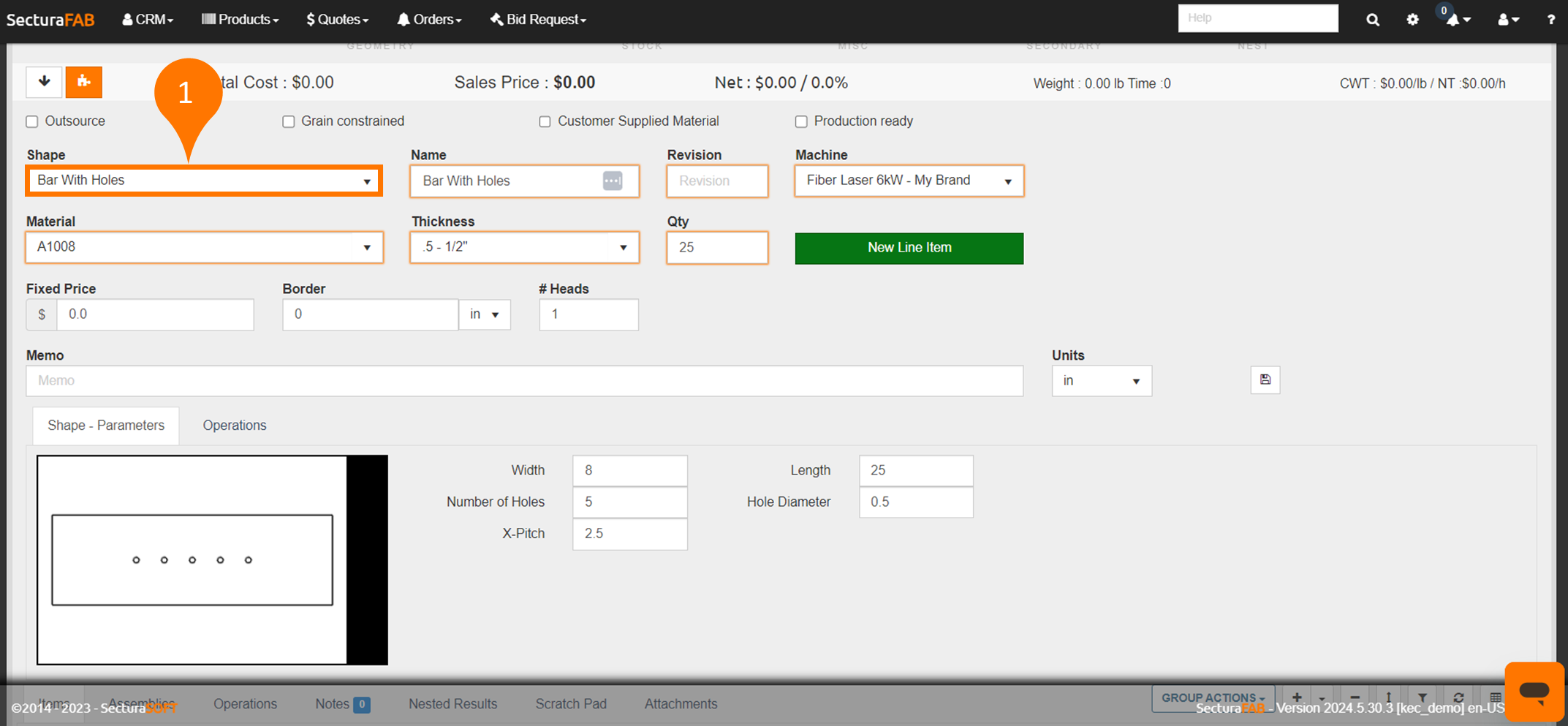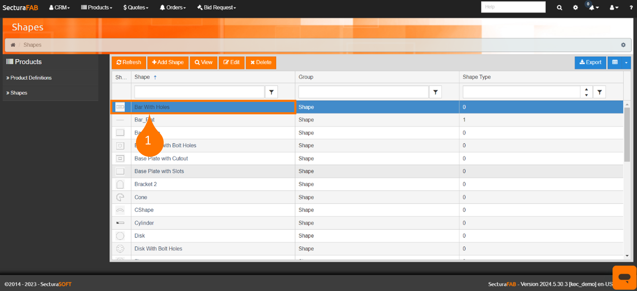 2. To edit a shape's default parameters, select the hyperlinked name of the shape.  Let’s edit the bar with holes to have 7 holes when it is selected for quoting.