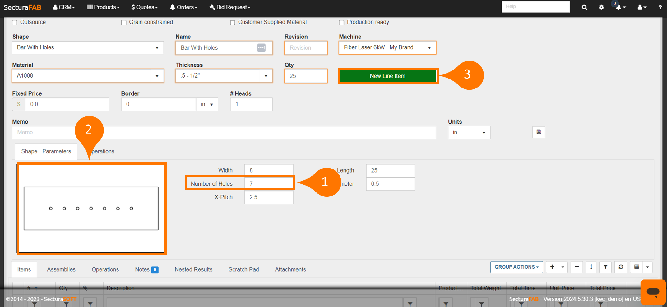 4. After filling in the parameters for the shape, make edits to the width, number of holes, x-pitch, length, and diameter. Once these inputs are edited the image window will adjust to reflect the changes. Let’s change the number of holes to 7. Finally, select “New Line Item” to add it to your quote.