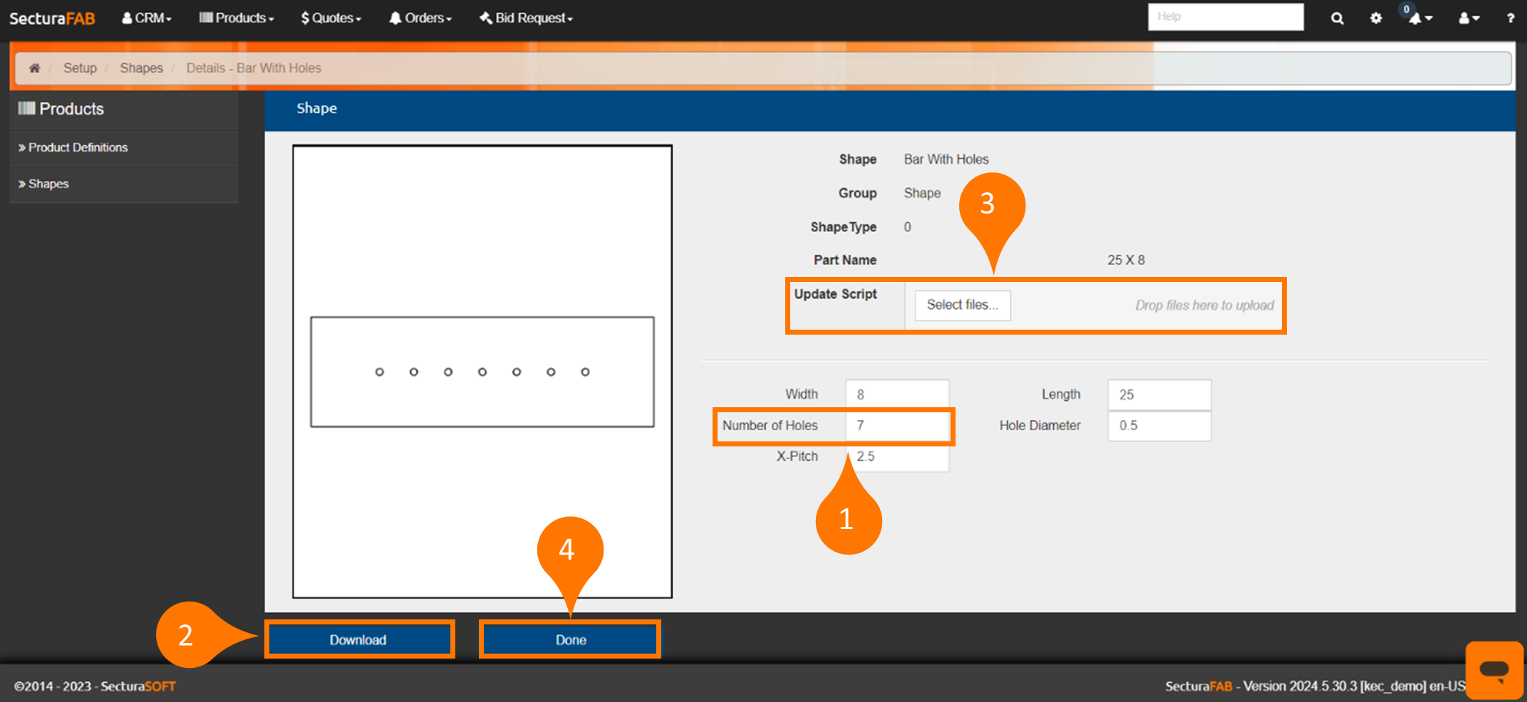 3. Edit the default number of holes to 7. Here you are also able to download the shape file and make changes. Re-upload the file using “Update Script.” Finally, select “Done” to save changes.