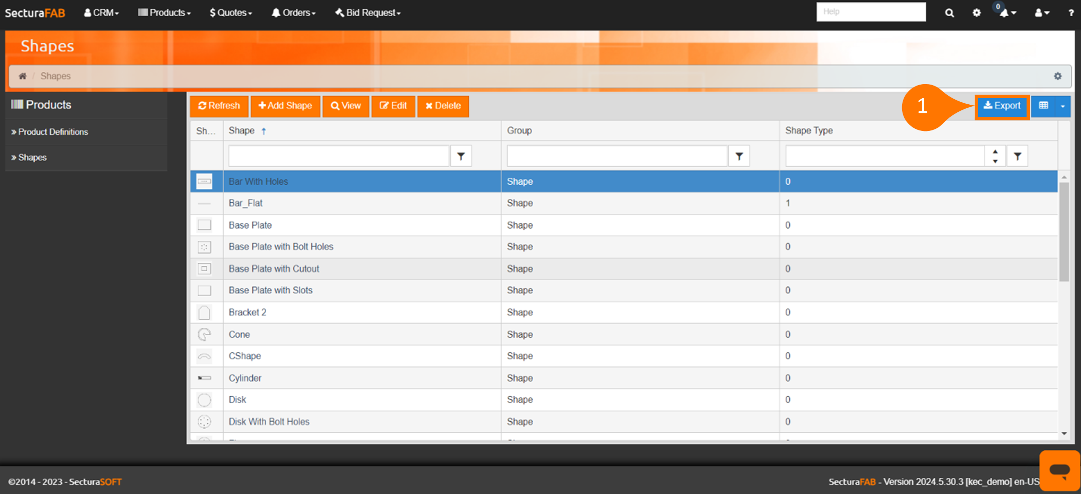 4. Before adding a new shape, export an existing shape file in SecturaFAB for a template of how they are formatted. Highlight a shape and select “Export.”