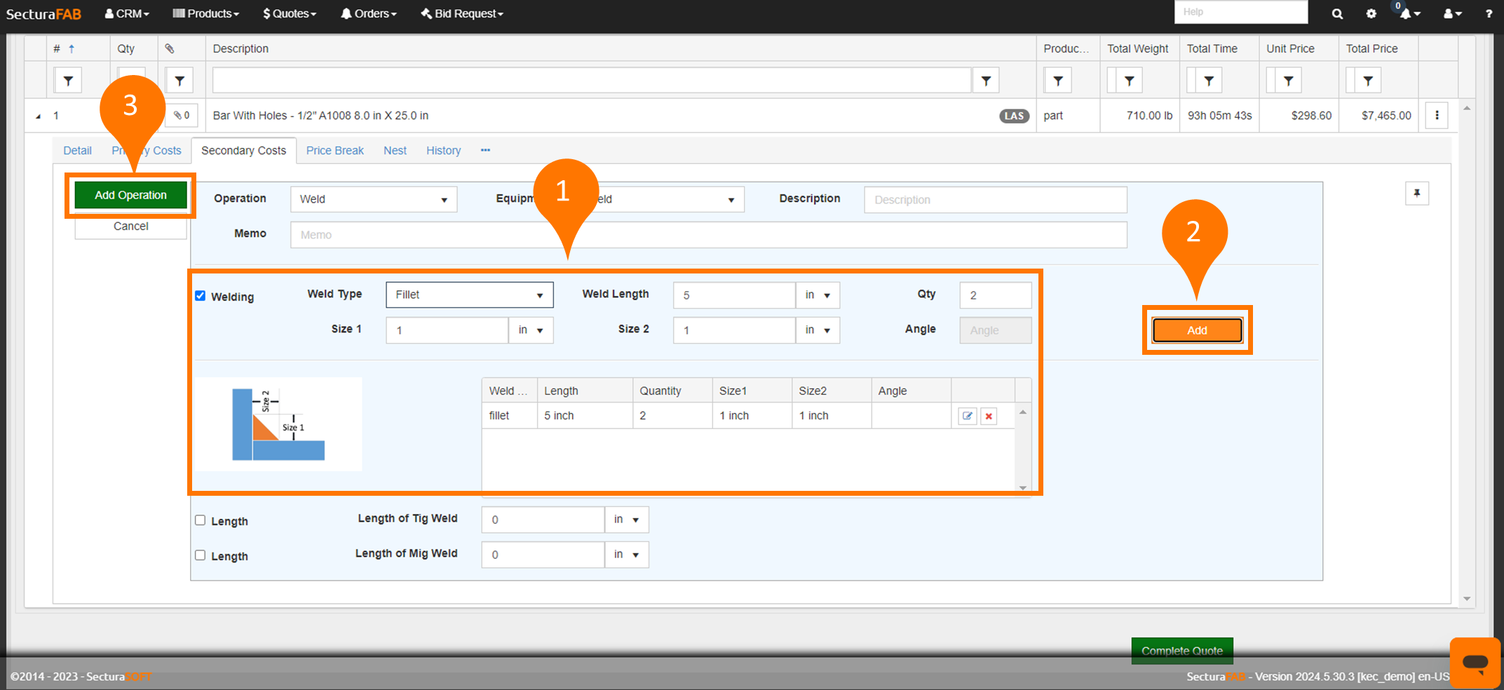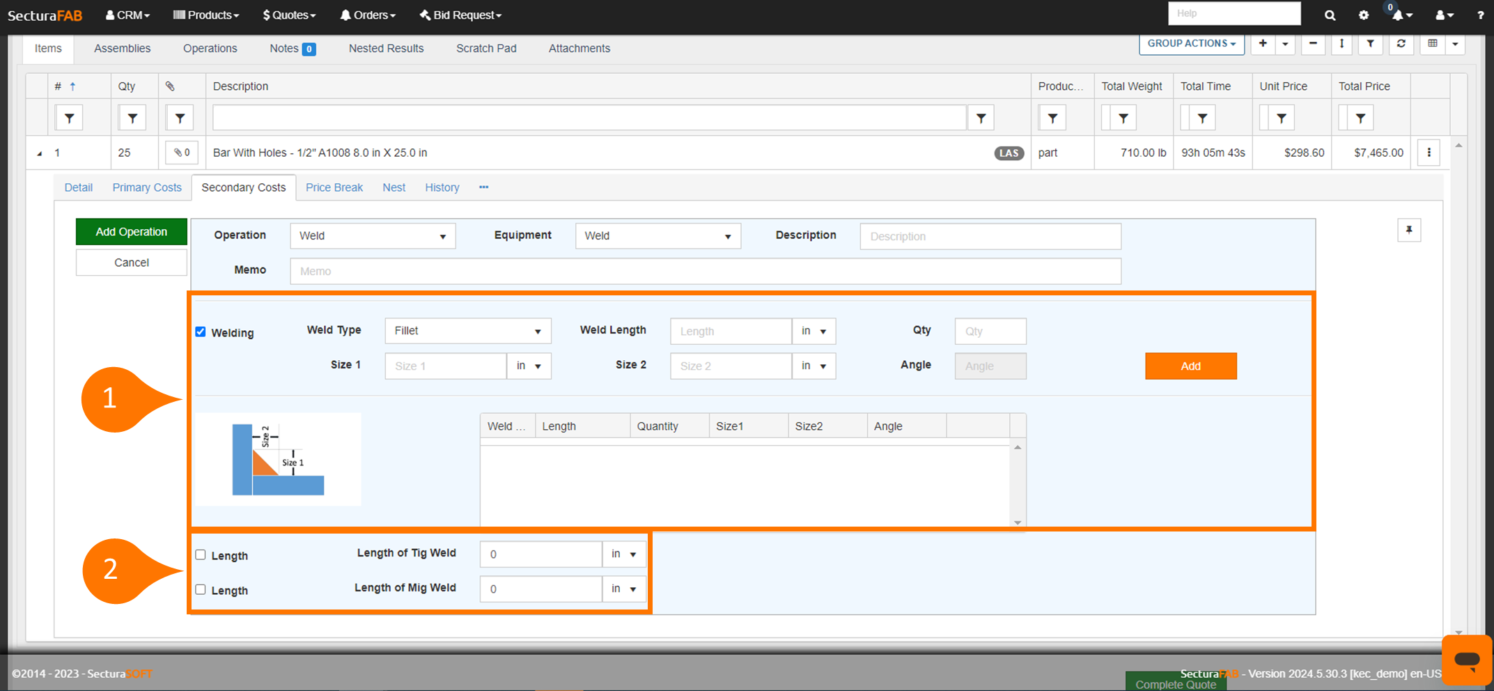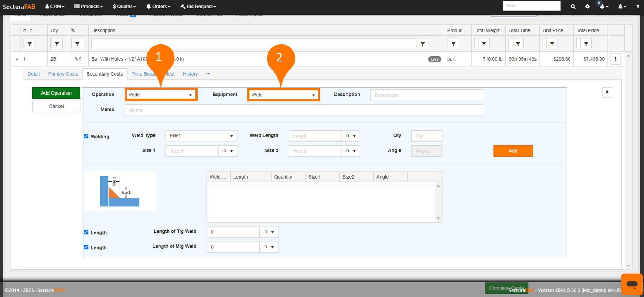 1. First you will need to quick add a weld operation. Learn more about how to use “quick add” for a welding operation in our resource center. After quick adding a weld operation you will be able to add it as a “Secondary Cost” to a line item. In this example, our operation is “Weld” and the equipment is “Weld.”