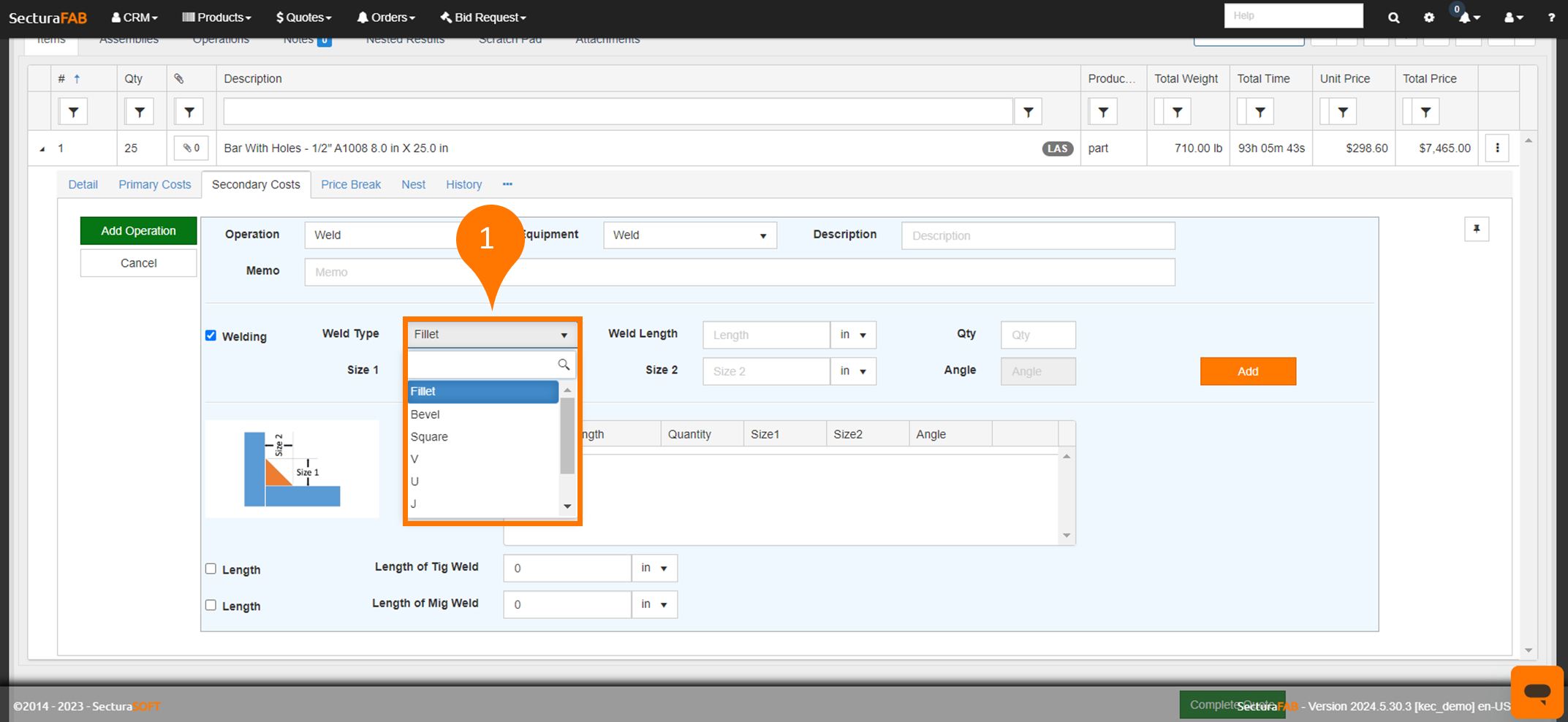 Discover SecturaFAB's welding operation and specialized calculator. Quickly quote for weld types such as fillet, bevel, square and more.