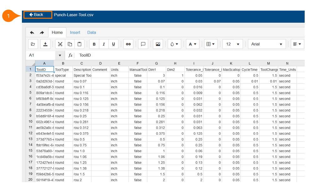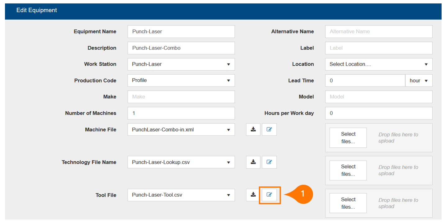 3. All the information and data tied to your punch equipment, including the tool file is shown. Select "Edit" to open a new window with the tool file. SecturaFAB allows you to make edits without exporting to a CSV.