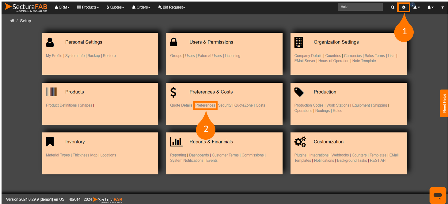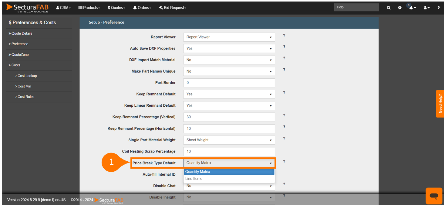 Start by setting your default option for Price Breaks. Navigate to "Preferences" from the Preferences & Costs settings. You can choose between: