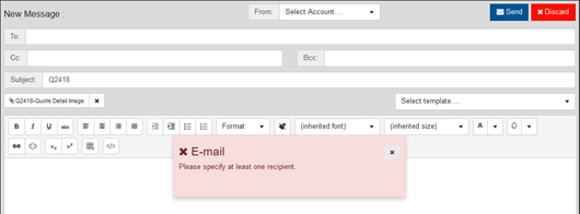 - In this release, neglecting to specify a recipient when sending a quote via email prompts a helpful message: "Please specify at least one recipient." In earlier versions, the window would erroneously signal success and close without validation. This correction guarantees that valid recipients are entered, mitigating the possibility of inadvertently sending a quote with blank or invalid recipient information.