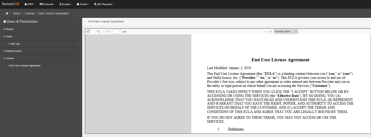- After log-in all users will see the screen below pop up and are required to accept the EULA. Once accepted you can always view or download the EULA by navigating to the Setup page under Users & Permission -> Licensing. If you have any questions regarding this document please contact our Customer Success team at help@secturasoft.com.