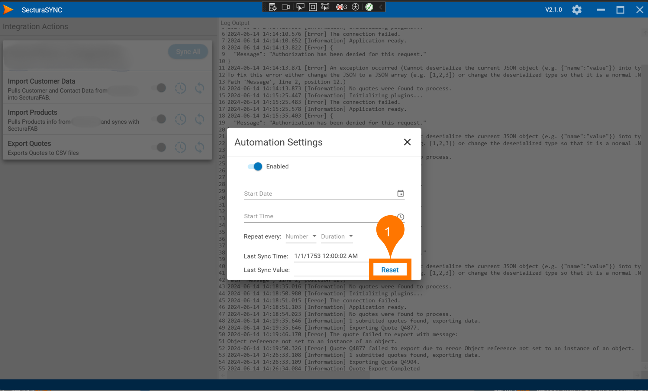 Whether the message says “[no customer, vendor, linear, or plate] updated since last sync date XX/XX/20XX 10:00 AM,” this means you have already imported a product at an earlier time and date. To import the remainder of the products or to import them into a different tenant, you must reset the sync time.