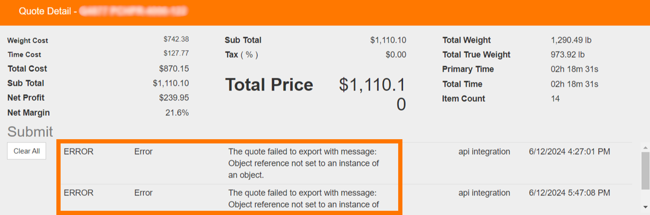 If the message reads “No customer could be found for identifier,” confirm that a valid customer from your ERP is filled out in SecturaFAB.
