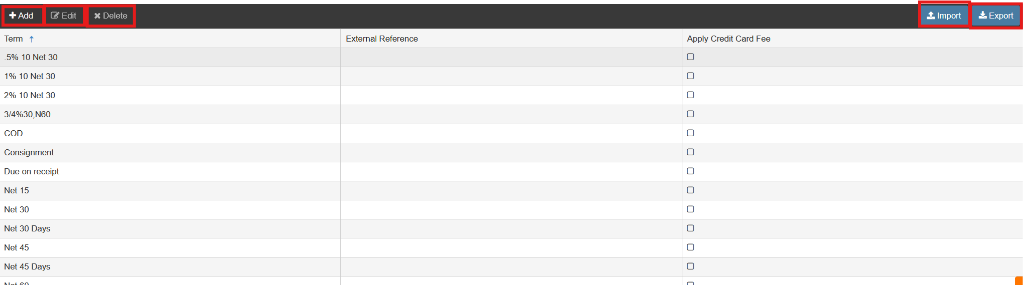 3.) From here you can see a list of existing sales terms. You also have the ability to Add, Edit, Delete, Import, and Export your sales terms.