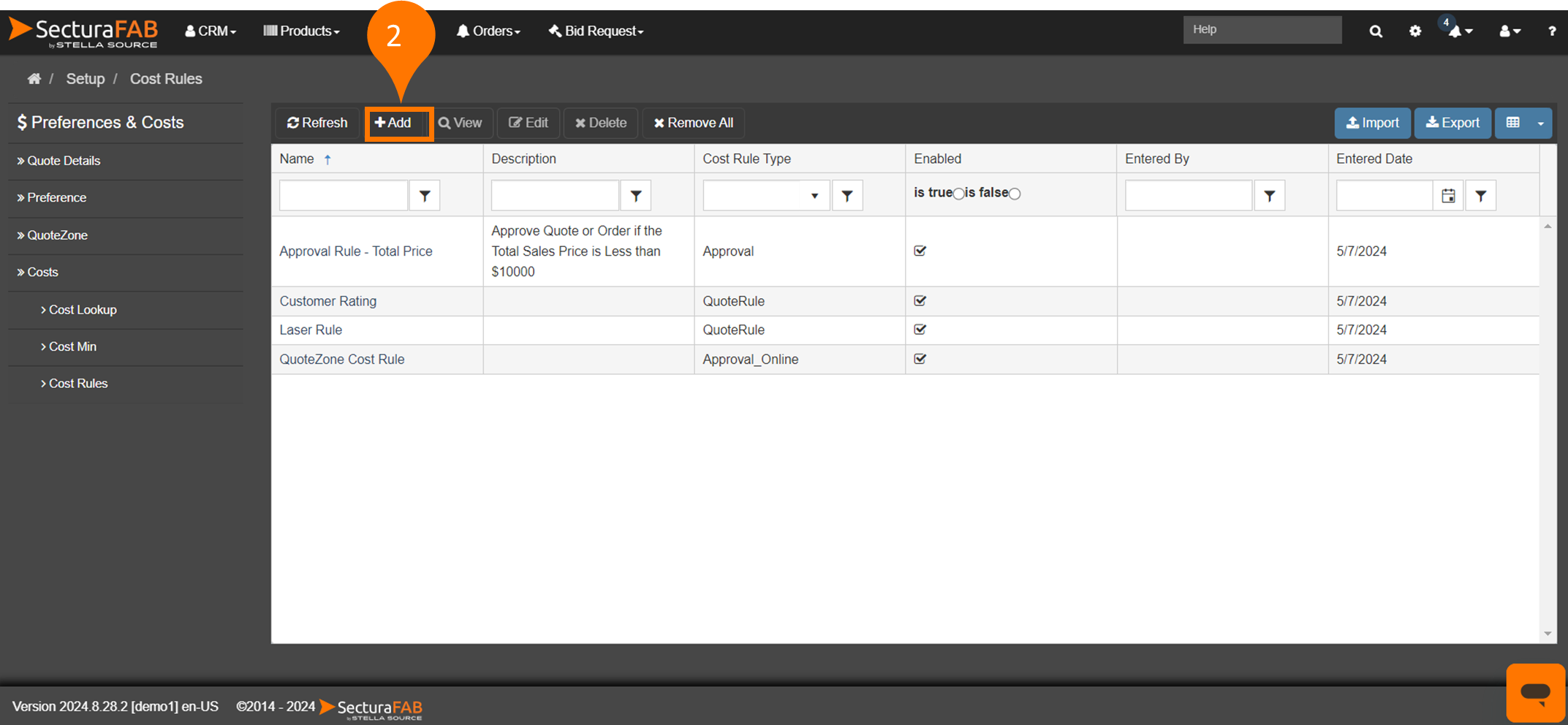 Select "Cost Rules." Here you can see a list of any current rules for your tenant. Select "Add" to create a new rule.