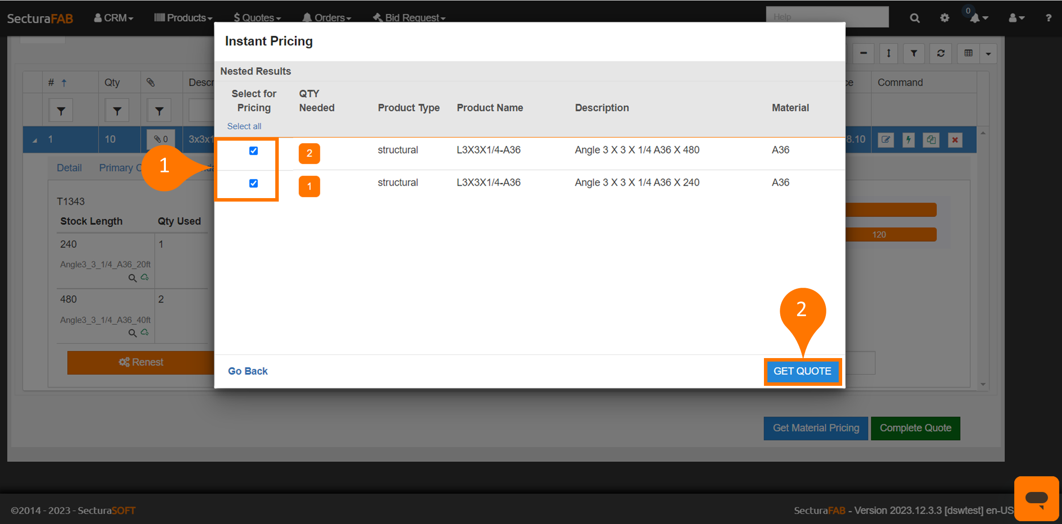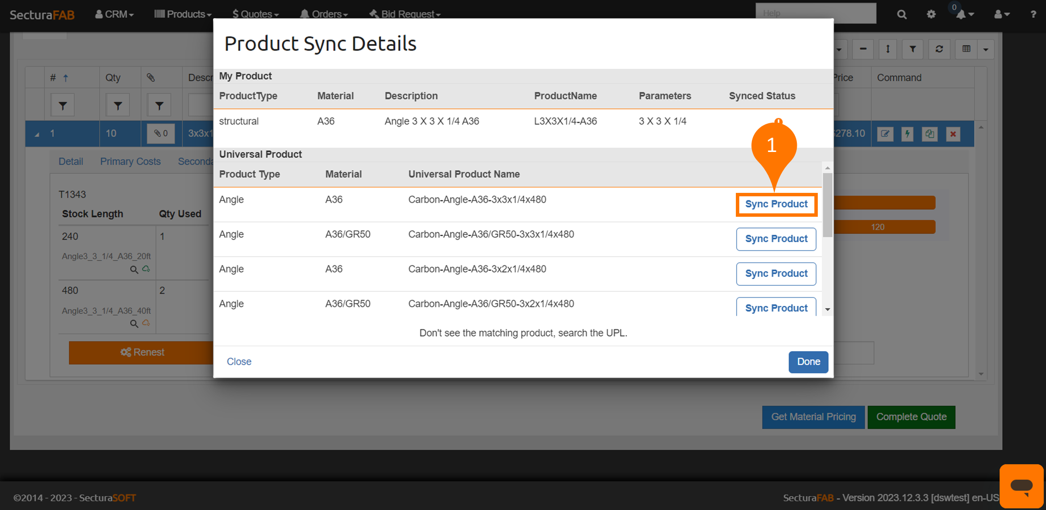 First, you’ll start a quote with your products. After nesting, RTP then prompts you to “map” your product to your supplier’s product — for example, you might call a product “Flat Bar 1/2 x 2 1/2 A36” and your supplier calls the same product “FB 1/2 x 2 1/2 A36.” Once you tell SecturaFAB those products are a match, you can request the price from the supplier and apply it to your quote.