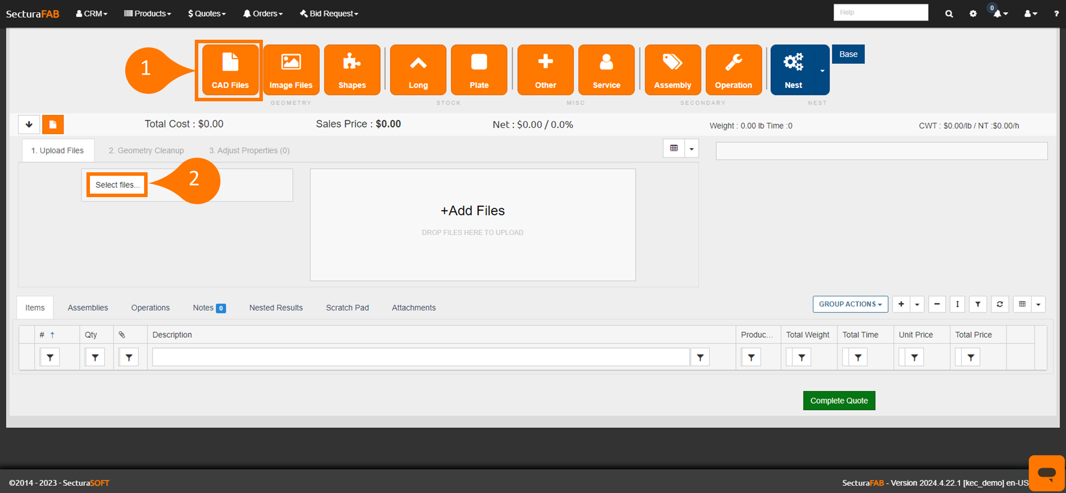 1. Select “CAD Files” when starting a new quote. Then, select “Select Files” to upload a STEP file from your device.