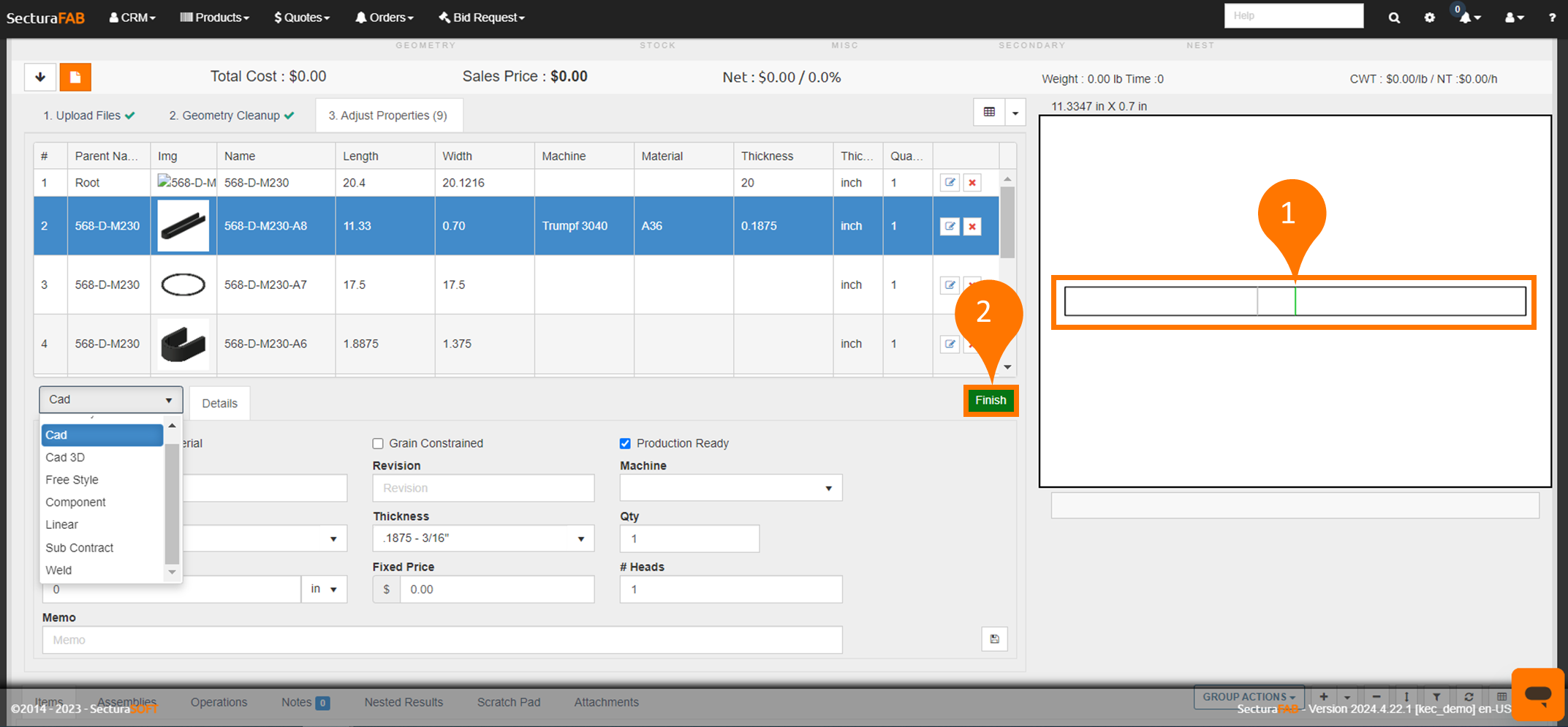 3. First, identify CAD parts or parts needing to be laser cut. Select the dropdown menu and choose “CAD.” Additional types include: