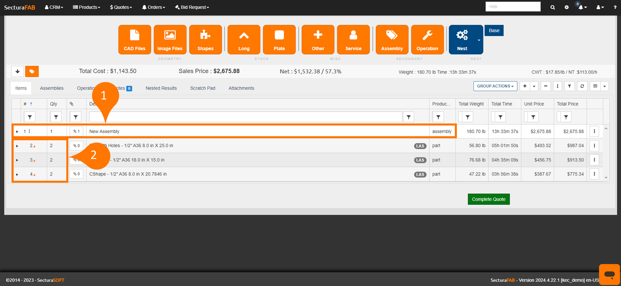 5. The new assembly will display as a new line item containing the root (name) and the subcomponents with indented orange carets.