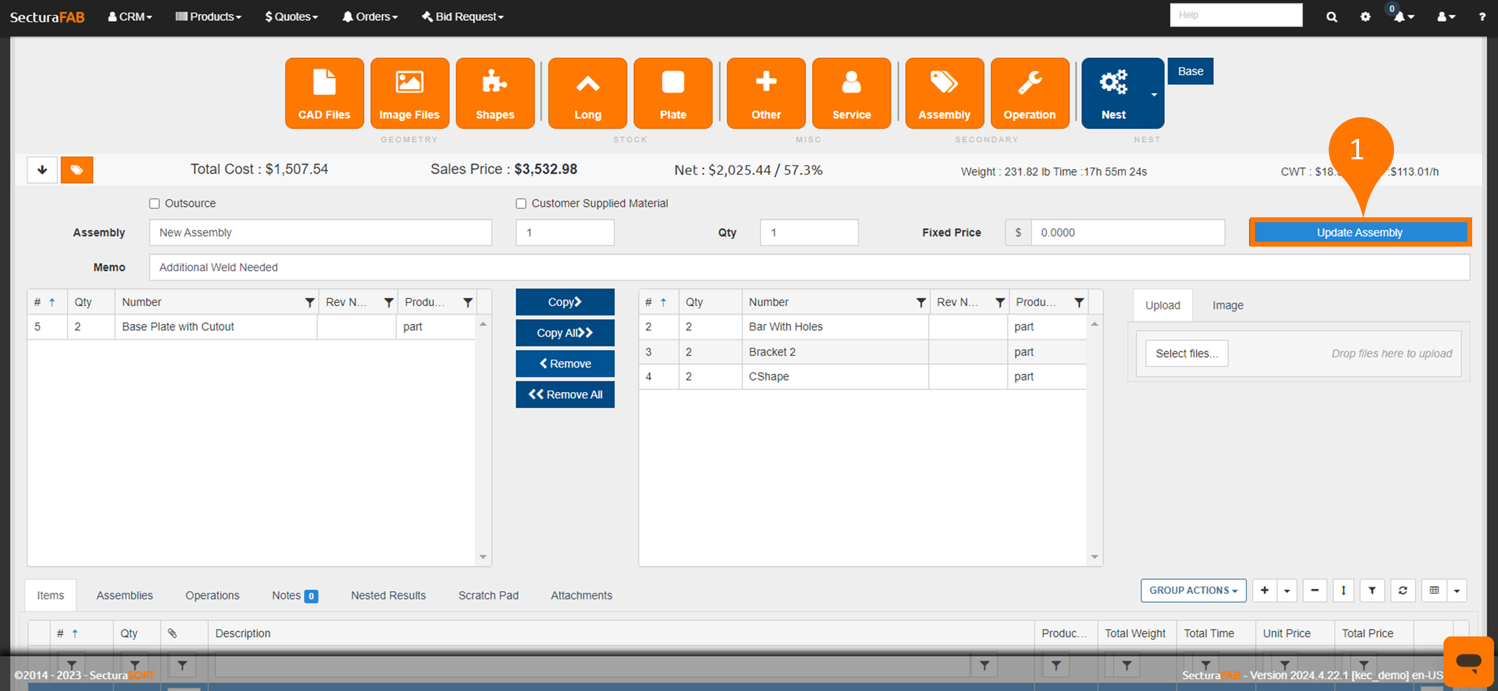 2. Add a new line-item or adjust the quantity as needed. Select “Update Assembly” to save changes.